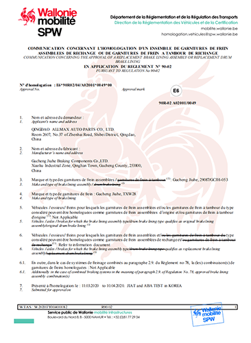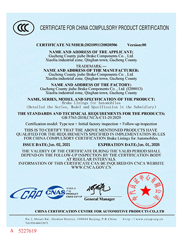故城縣九和制動(dòng)元件有限公司主導(dǎo)產(chǎn)品為:汽車(chē)剎車(chē)片、裝載機(jī)剎車(chē)片。剎車(chē)片采用高溫高壓的熱壓工藝、設(shè)備、生產(chǎn)線(xiàn)、能保證質(zhì)量穩(wěn)定,有為主機(jī)廠(chǎng)配套生產(chǎn)的經(jīng)驗(yàn)和能力。劉如根商標(biāo)是公司主要商標(biāo),公司還有飛人標(biāo)牌、蛟龍牌、橫空出世等品牌!公司有多個(gè)剎車(chē)片檢驗(yàn)設(shè)備,剎車(chē)片摩擦性能定速摩擦試驗(yàn)機(jī)與國(guó)家非金屬礦制品檢驗(yàn)中心試驗(yàn)機(jī)是同公司生產(chǎn)的同型號(hào)試驗(yàn)機(jī)。拖曳試驗(yàn)機(jī)2020年通過(guò)中國(guó)建材檢驗(yàn)集團(tuán)咸陽(yáng)有限公司檢驗(yàn)合格,剪切試驗(yàn)機(jī);布氏和洛氏試驗(yàn)機(jī)。2021年公司通過(guò)國(guó)家強(qiáng)制性CCC認(rèn)證、通過(guò)過(guò)19001-2000idt ISO 9001:2015質(zhì)量體系認(rèn)證,IATF16949認(rèn)證,歐盟Emark認(rèn)證。剎車(chē)片執(zhí)行GB/T11834-2011、GB 5763-2018標(biāo)準(zhǔn)。公司產(chǎn)品先后曾給山東臨工、徐工、卡特彼勒(山工)、徐州美馳車(chē)橋公司、肥城金城橋公司,山東路通橋箱科技公司,山東博士樂(lè)公司,郯城郯液公司,日照金···